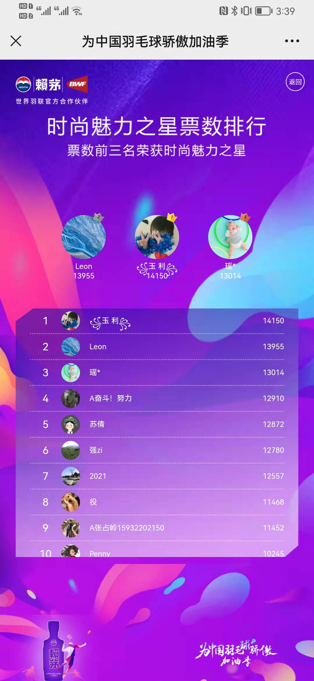2021年世界羽毛球锦标赛于12月19日晚在西班牙韦尔瓦完美收官,五项冠军被四个队伍瓜分,在一众战将的奋力拼搏下,国羽斩获1金1银2铜佳绩。而随着2021年度羽球重磅赛事完结,世界羽联官方合伙伙伴赖茅发起的“为中国羽毛球骄傲加油季”活动也完美收官,一众球迷或竞猜为国羽鼓劲助威,或用实际行动晒出自己的羽球风采为国羽加油打气,赢得赖茅好礼的幸运用户名单也火热出炉。